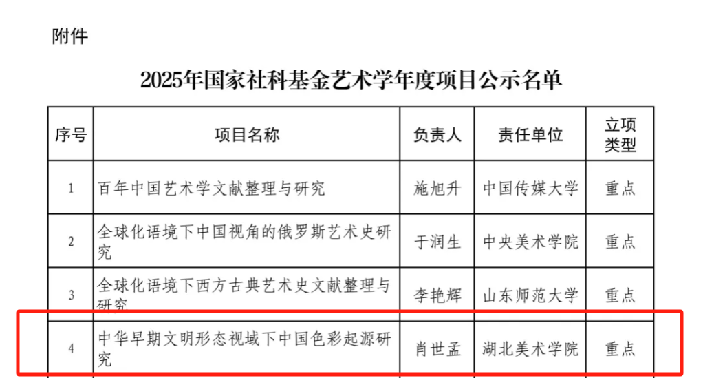8月18日,2025年国家社科基金艺术学年度项目立项结果揭晓,我院肖世孟教授申报的《中华早期文明形态视域下中国色彩起源研究》成功获批!该项目以中华早期文明形态为研究背景,深入探索中国色彩的起源与文化内涵。肖世孟教授长期致力于中国传统色彩与文化研究,此次立项是其学术积淀的重要成果,也是学院在国家级科研项目申报中取得的又一突破,标志着我院在艺术学理论研究领域迈入新高度。