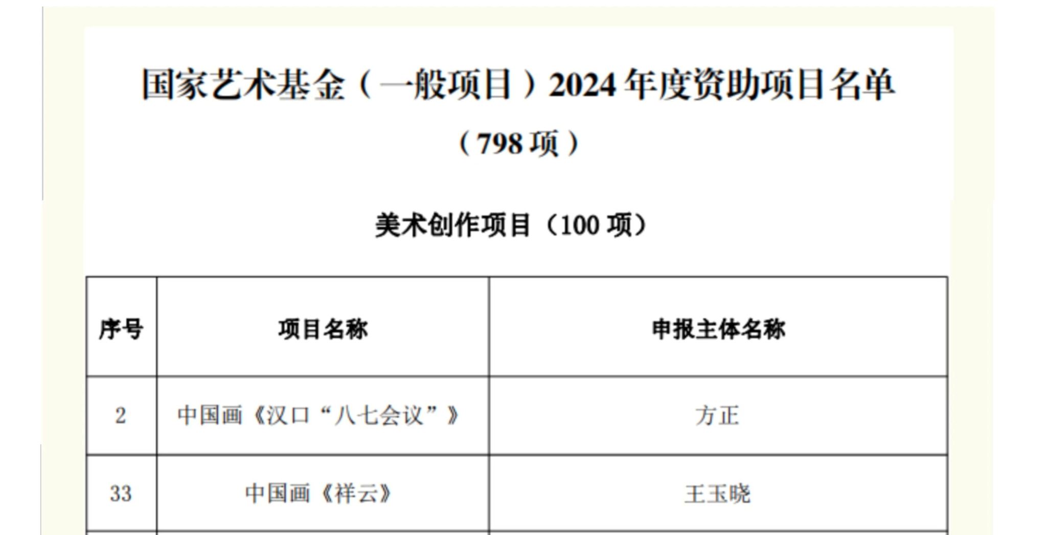 3月1日,国家艺术基金(一般项目)2024年度资助项目立项名单公布,中国画学院副院长方正教授申报的中国画《汉口“八七”会议》,王玉晓教师申报的中国画《祥云》,获美术创作类立项。 据悉,国家艺术基金经国务院批准于2013年成立,旨在繁荣艺术创作,培养艺术人才,打造和推广精品力作,推进艺术事业健康发展。它与国家自然科学基金、国家社科基金并列为我国政府设立的三大科研基金。 近五年,中国画学院已成功获批国家艺术基金项目立项7项。其中艺术人才培养资助项目1项,美术创作类资助项目4项,青年艺术人才资助项目2项。今后中国画学院也将一如既往充分发挥国家艺术基金的引领作用,齐心协力助推学校高质量发展。