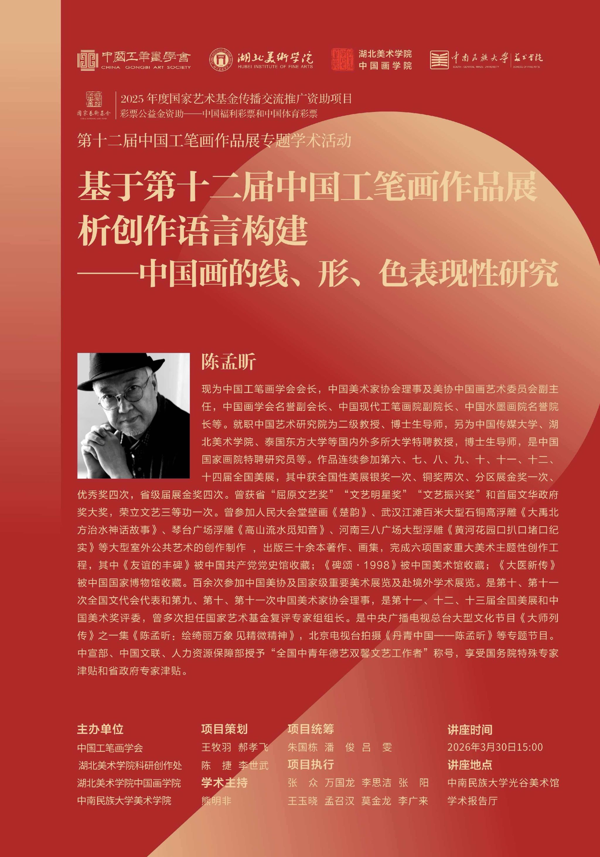 为推动中国画学院学科建设与创作水平提升,深化我院师生对当代工笔画创作前沿的理解,3月30日下午,我院特聘教授、中国工笔画学会会长陈孟昕做客中南民族大学光谷美术馆学术报告厅,为我院师生带来了一场题为《基于第十二届中国工笔画作品展析创作语言构建——中国画的线、形、色表现性研究》的专题讲座。讲座由中国画学院副院长熊明非主持。
